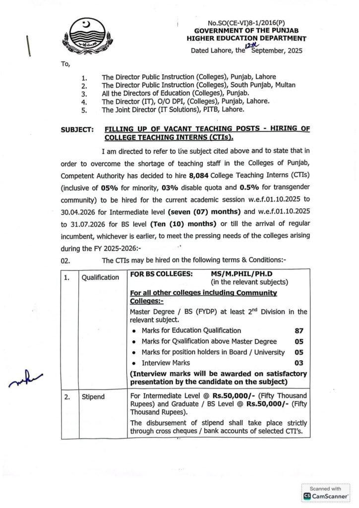 CTI Jobs 2025 have been regularly declared by the Higher Education Department (HED) Punjab to recruit deserving and limited positions as College Teaching Interns in management colleges across Punjab. These positions offer a brief education opportunity for graduates and postgraduates, the one be going to gain a realistic education experience while earning a monthly wage. If you’re ready to step into the education declaration, CTI Jobs 2025 offer a beautiful opportunity to polish your skills, build your return to, and instruction at the lyceum level. Vacancies are usable for two males and two women, and conscription will be contingent on merit.