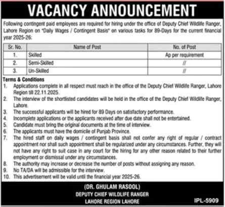 The Deputy Chief Wildlife Ranger Office, Lahore Region, has released diversified vacancies on a routine salary/contingent support for 89 days under the 12-month accounting period 2025-26. These vacancies are open for competitors bearing various ability levels, including skilled, tractor-trailer-skilled, and inexperienced types.